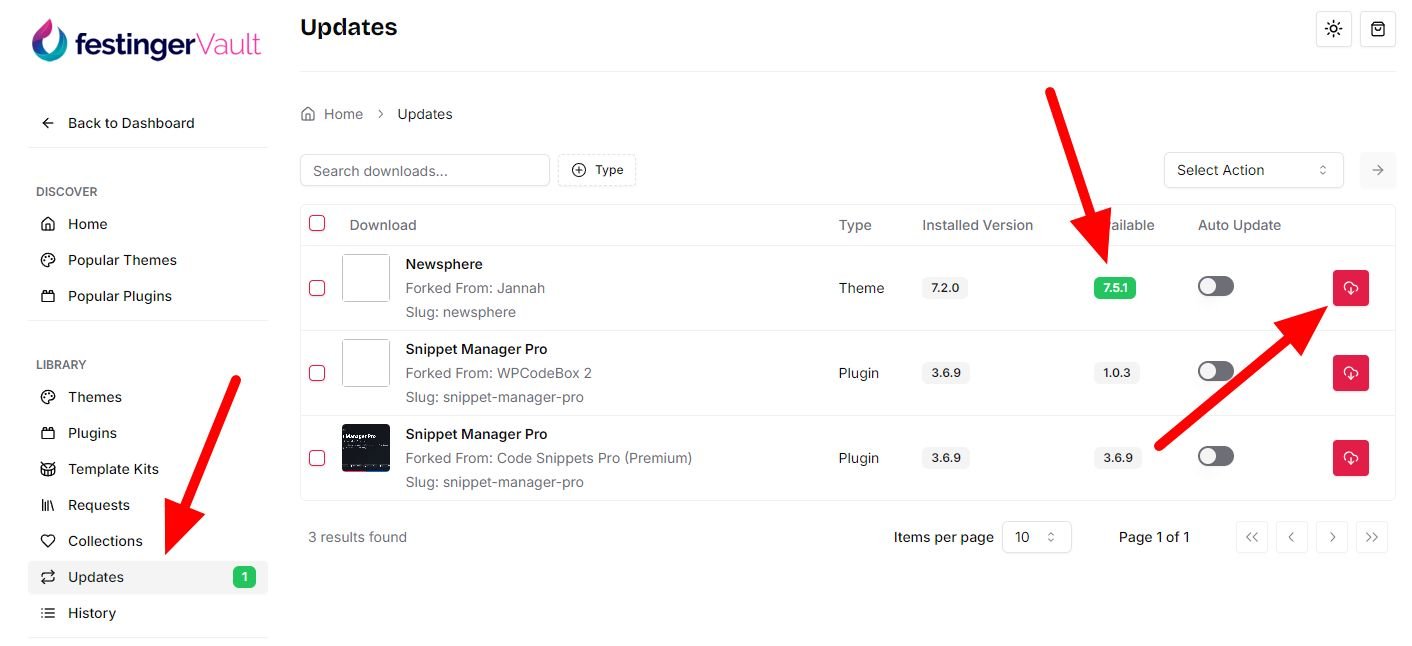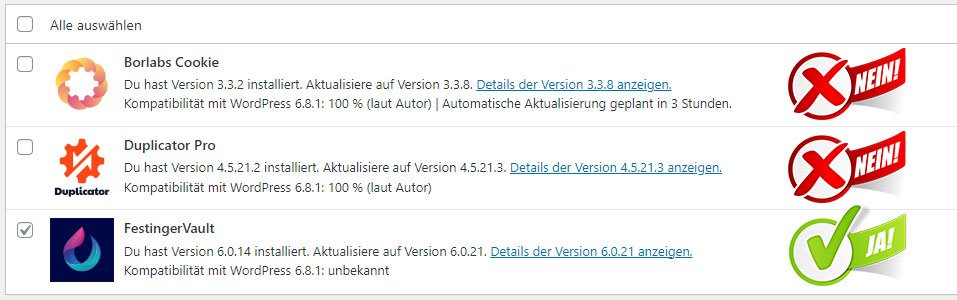 So machst Du die richtigen Updates. Gehe wieder in das FestingerVault Dashboard. Klicke dann unten auf den Menüpunkt "Updates". Jetzt siehst Du welche Updates zur Verfügung stehen. Bei jenen die eine grüne Versionsnummer anzeigen, kannst Du ein Update durchführen: